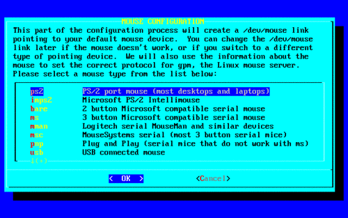 В этом подразделе вам надо всего лишь указать тип своей мыши и решить, хотите ли вы задействовать при загрузке включение поддержки мыши в консоли - gpm(8).