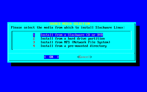 В этом разделе вы выбираете источники, с которых будет выполняться установка Slackware. В настоящее время таких источников четыре: CD-ROM, жёсткий диск, NFS или предварительно примонтированный каталог.