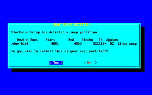 Если вы создали раздел для свопинга (см. Разд. 3.3), этот раздел позволит вам задействовать его. В нём будут автоматически определены и показаны разделы для свопинга вашего жёсткого диска, позволив вам выбрать один для того, чтобы отформатировать и включить его.