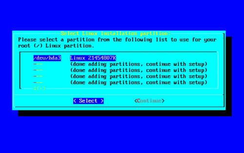 Первым пунктом в этом разделе является выбор раздела, в который будет установлена корневая файловая система (/). После этого вы сможете создать файловые системы на других разделах на своё усмотрение. (Например, вы можете создать третий раздел, скажем, /dev/hda3, для размещения на нём файловой системы для домашних каталогов. Это просто пример. Создавайте разделы так, как вам нравится.)