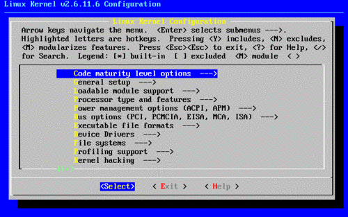 Новички наверняка найдут использование menuconfig самым простым и лёгким. Доступны экраны с подсказкой, поясняющие различные части ядра. После завершения настройки ядра выйдите из программы-конфигуратора. Она сама запишет все необходимые конфигурационные файлы. Теперь можно подготовить для сборки дерево с исходными текстами: