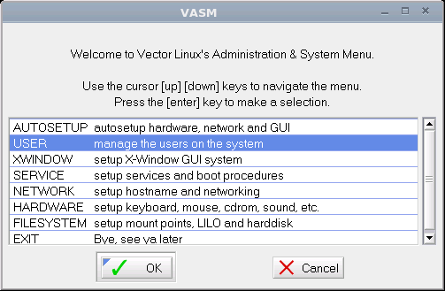"VASM" это сокращение от "Vector Administrative and Services Menu", является главным инструментом конфигурирования VectorLinux. VASM появился в VectorLinux 2.0, с каждым релизом расширял свои возможности и обрел графический интерфейс (начиная с версии SOHO v3.2).