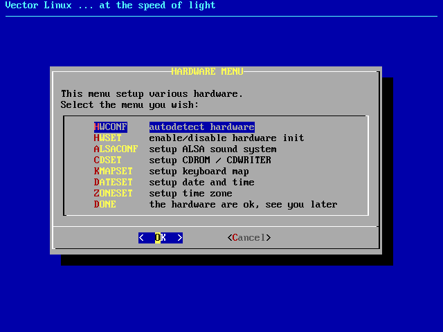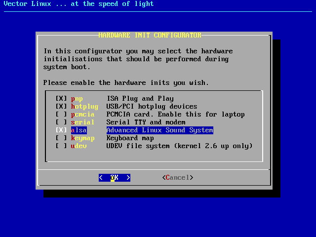 Если ALSA обнаружено наличие устройств, то после выбора устройства и нажатия "OK" загрузится драйвер этого устройства и настроится на автозапуск при загрузке системы. Нажмите "Ok" для завершения настройки, снова появится меню "Hardware Menu".