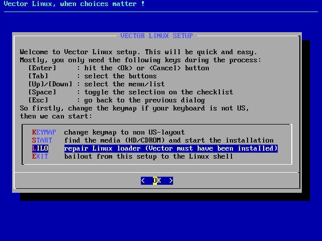 При начале установки есть два важных момента. Первый касается вашего контроллера жестких дисков. На сегодня известно три типа контроллеров: IDE, SCSI и SATA. При загрузке установочной программы необходимо будет выбрать тип ядра, поддерживающего ваш контроллер. Второй момент заключается в типе установки. В зависимости от возможностей вашего компьютера, Vector Linux можно установить одним из методов: