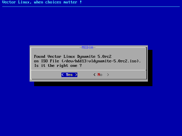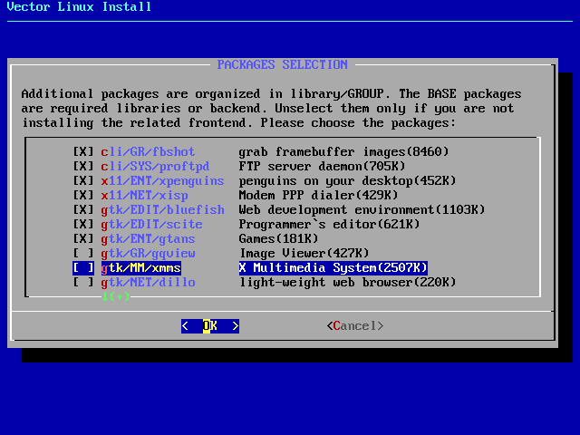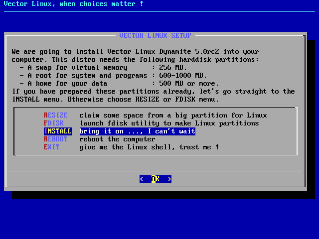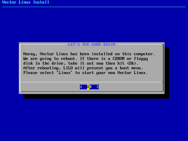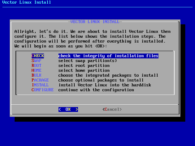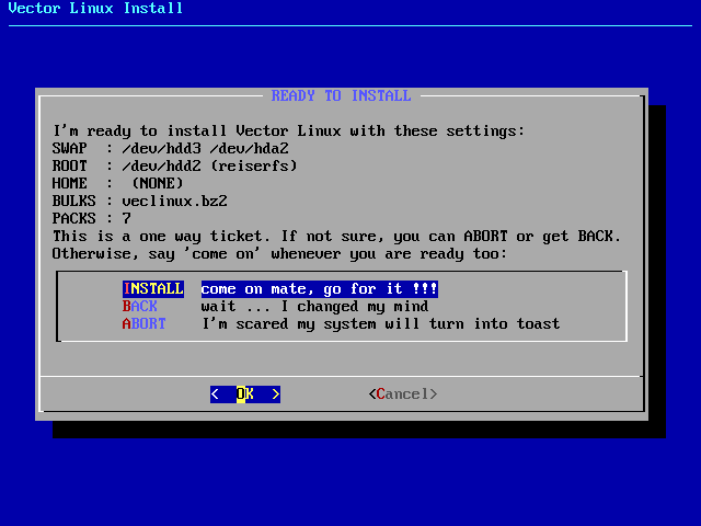 - INSTALL - начало установки VectorLinux. Будет показан набор установок, которые вы произвели. Будет возможность вернуться назад или отменить инсталляцию. Если уверены, нажмите OK для продолжения установки VectorLinux.