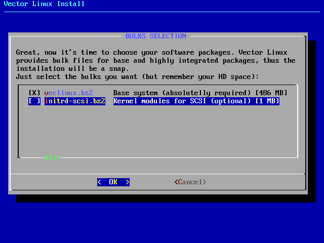 - BULK - здесь можно выбрать, какие готовые массивы установить. Под массивом здесь понимается набор предустановленных, сжатых, интегрированных между собой программ. Среди них есть veclinux.bz2, который представляет базовый набор приложений, необходимых для функционирования системы и для установки дополнительных программ.