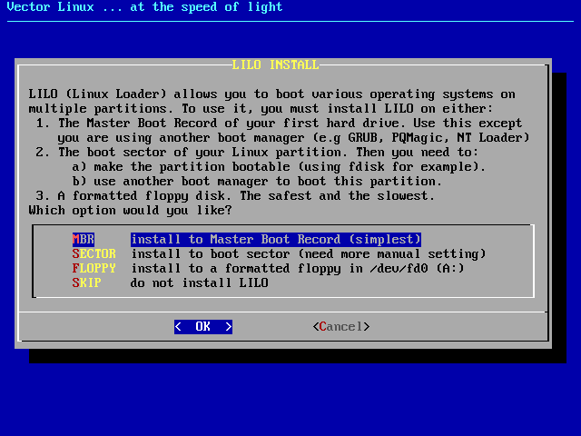 - корневой раздел (если вы установили VL на /dev/hda2, lilo также будет установлен на /dev/hda2)