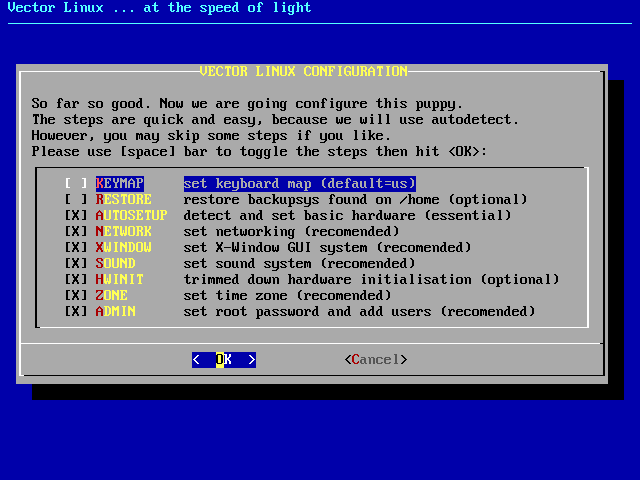 Первый экран показывает шаги конфигурации и позволяет выбрать, какие из них пройти, а какие пропустить. Желательно выбрать все шаги. Далее вы пройдете через серию экранов конфигурации клавиатуры, автоматической настройки основного оборудования, выбора настроек сети, видео, звука и временной зоны. Программа попытается автоматически определить большинство параметров.